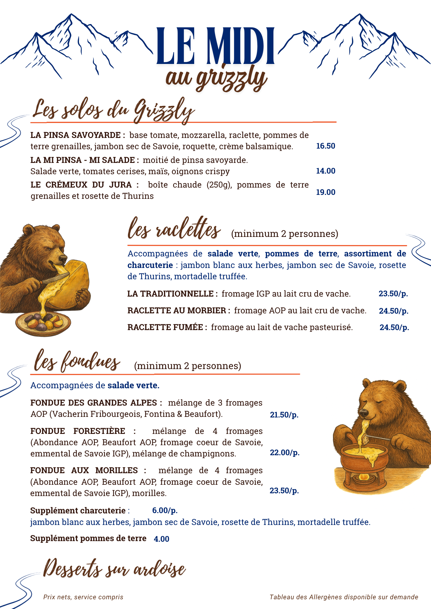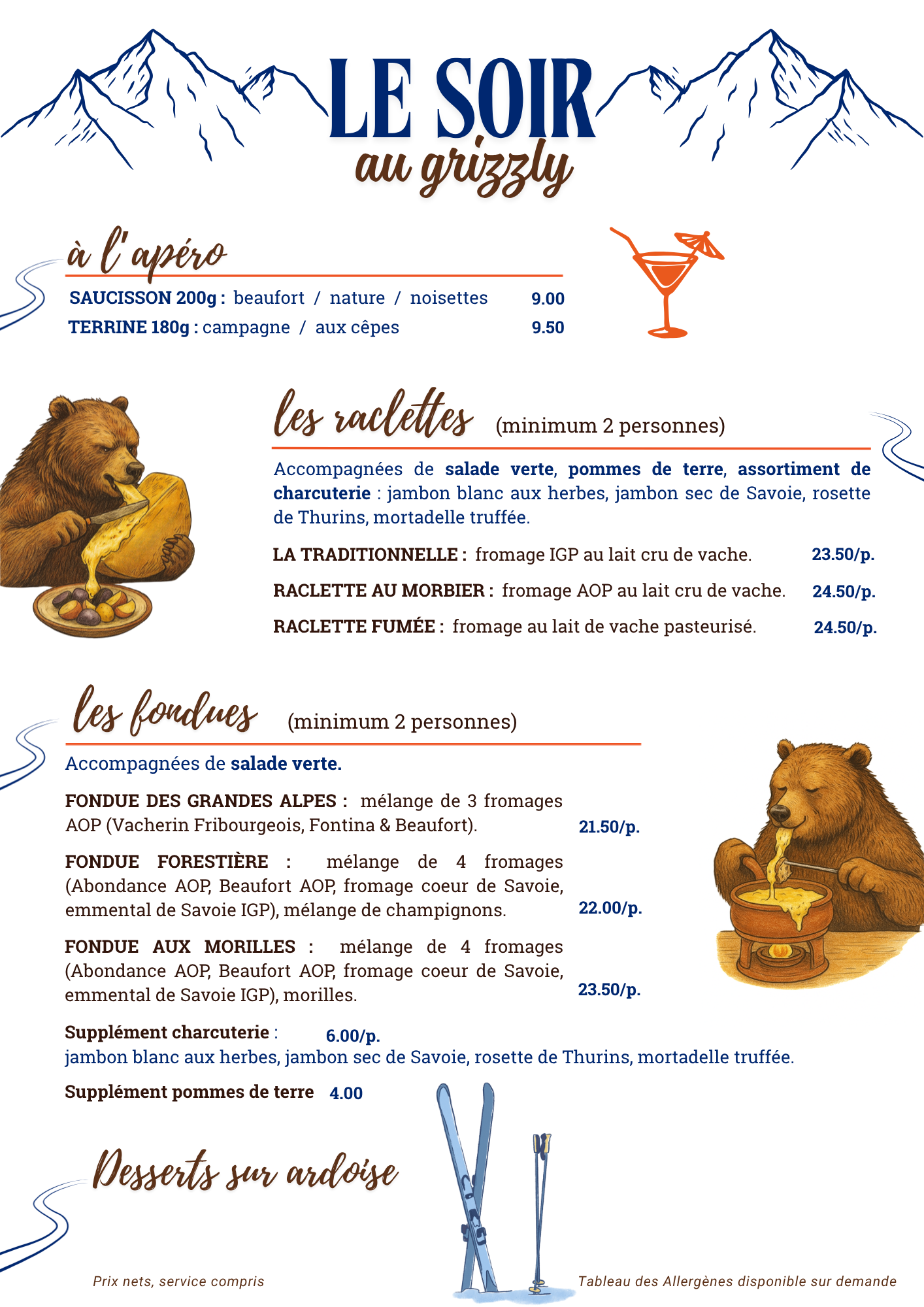 Ouvert du mardi au samedi, Le Grizzly vous propose de déguster les immanquables spécialités savoyardes : fondues et raclettes pendant toute la saison d'hiver.